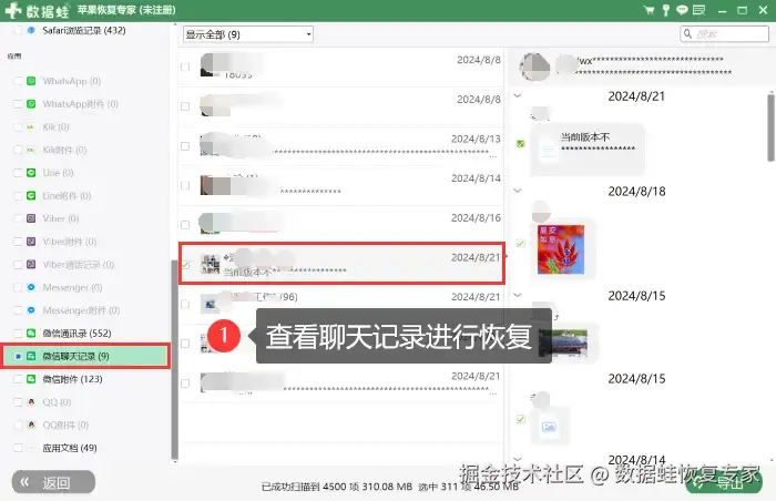 步骤2:耐心等待扫描的完成,扫描完毕即可选择 【微信聊天记录】 查找需要的聊天记录进行恢复即可。