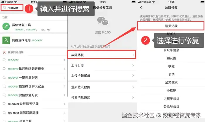 使用方法:在微信首页的上方输入 【recover】 并搜索,点击第一个 【微信修复工具】 进入,选择 【故障修复】 对 【聊天记录】 进行修复即可。