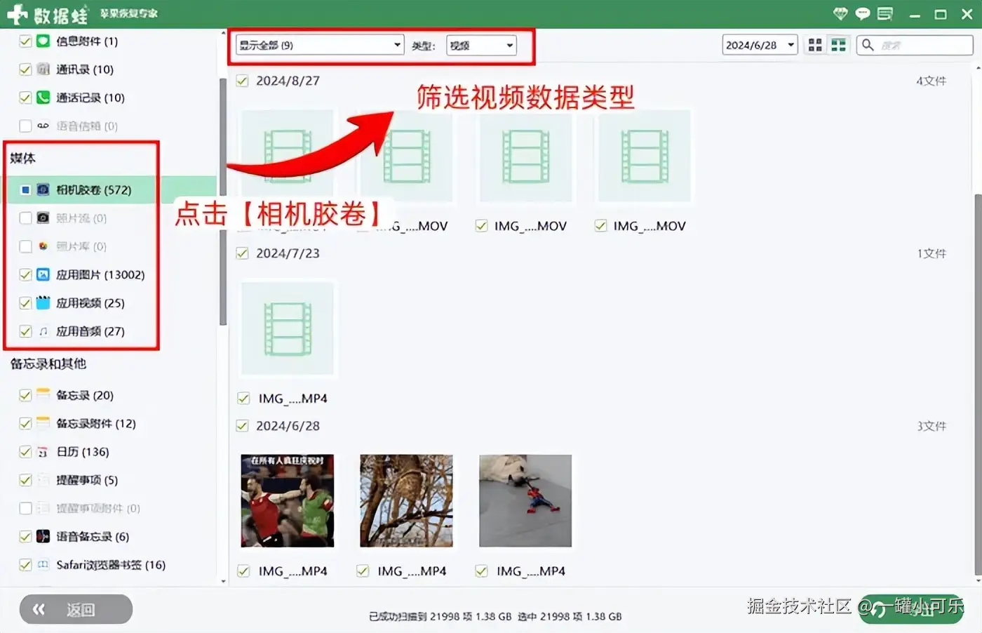 步骤2:数据扫描完成后,点击界面右侧应用栏的 【相机胶卷】 ,在屏幕上方筛选视频选项。