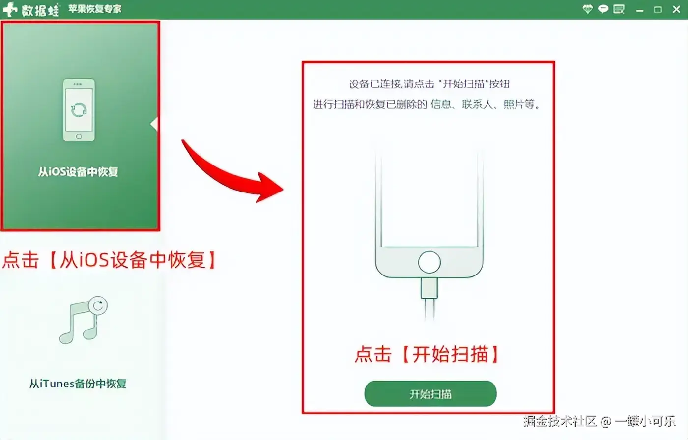 步骤1:用数据线连接手机和电脑,运行工具,选择从 【iOS设备中恢复】 的数据扫描方法,然后点击 【开始扫描】 。