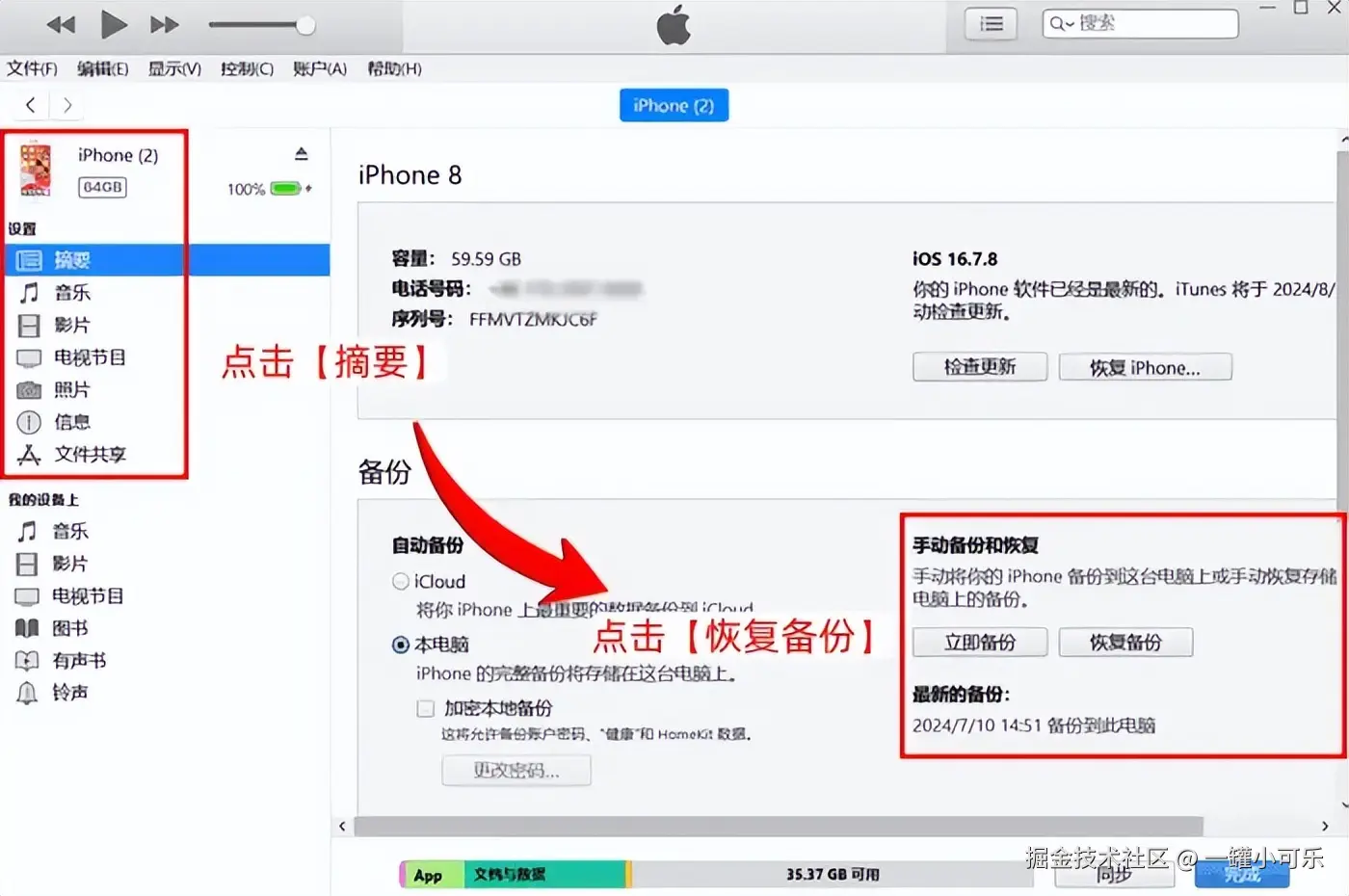 步骤2:在iTunes的界面中,依次点击 【摘要】-【恢复备份】 即可。