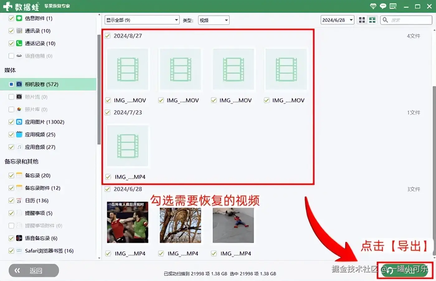 步骤3:根据数据筛选结果,勾选被删除的视频,然后点击 【导出】 即可。