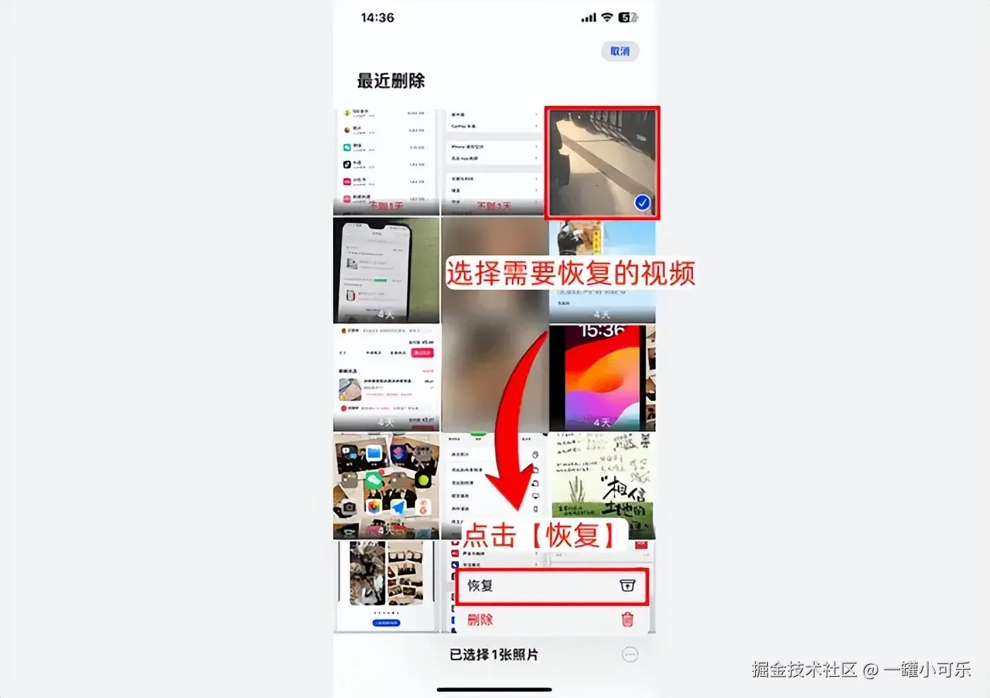 恢复手机视频的方法三:在【最近删除】的相册中恢复