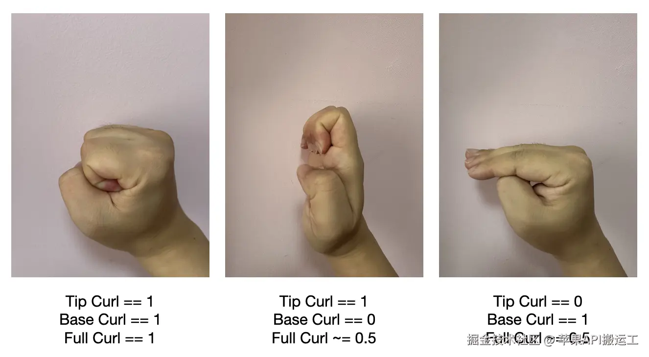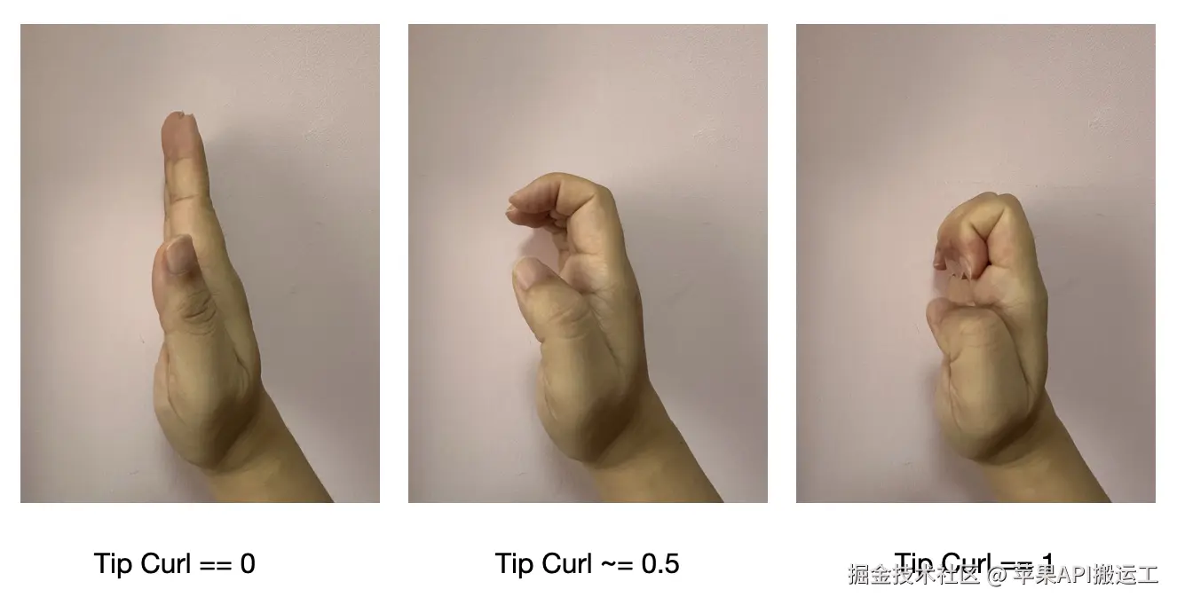 - 指尖卷曲度 tipCurl:手指上部关节的卷曲度,大拇指为