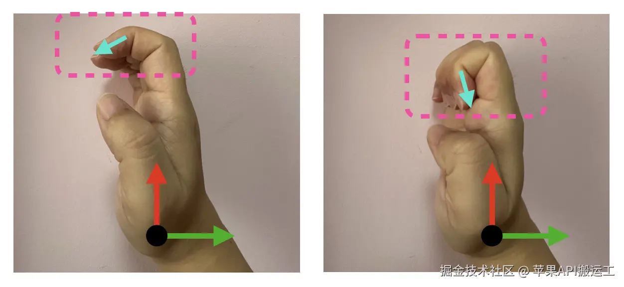 我们先来看看旧版本的算法最大问题就是:所有计算用到的向量,都是基于 手部 Anchor 空间 (手腕)的,这样就会导致手势变化过程中,指尖的关节 方向差异过大,相似度计算出现错误: