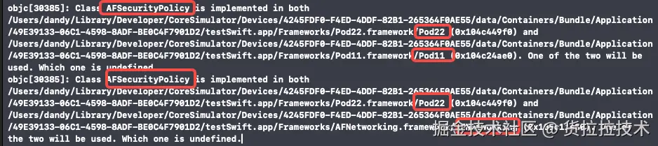 这种情况下,如果是Swift文件,需要手动排查;如果是相同的OC符号在不同的Mach-O中(即主工程可执行文件和动态库的Mach-O文件),我们可以在调试运行时在Xcode控制台打印看到。推荐改法也是下沉到基础库中。