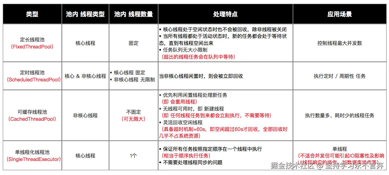 嫌上面使用线程池的方法太麻烦?其实Executors已经为我们封装好了 4 种常见的功能线程池,如下: