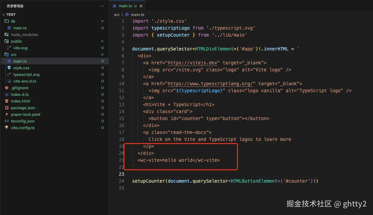 首先, 什么是自定元素, 要搞清楚这个我们就需要了解什么叫做元素(这同时会引出什么叫做语义化元素)!所谓的元素是针对html文本而言, 它组成了整个html骨架,不妨来列举一些常见的元素,比如:html,body,div,span, header…这些都是我们常见的元素, 它们有着自己的元素样式, 逻辑,名字等, 而自定义元素就是定义一个特殊的元素(包括元素: 名字,样式,逻辑)下面我们尝试修改一下vite模版提供给我们的代码实现一个我们自定义的元素吧!我们来实操一下试试: 首先打开src/main.ts文件, 我们尝试添加一个自定义元素hello world如下: