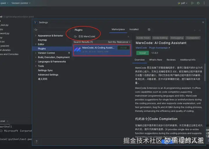 JetBrains与 Visual Studio Code都可以安装,比如下面就是JetBrains Idea中编程助手的安装,在市场搜索后进行安装