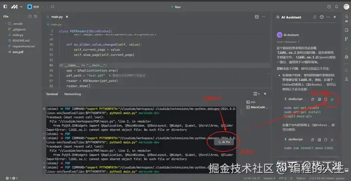当运行程序出现bug后,“AI Fix”图标会自动出现,点击后会可以通过AI生成相应的解决方案,解决方案里也会有相应的按钮半自动化的处理,非常的方便。