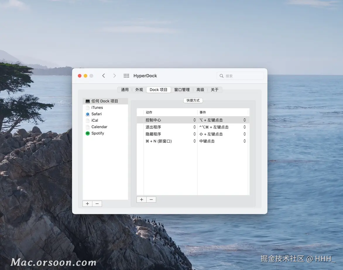 为您的 Dock 项目分配键和鼠标快捷方式以隐藏或退出应用程序、启动 Expose、打开 Safari 选项卡、Finder Windows 等等。