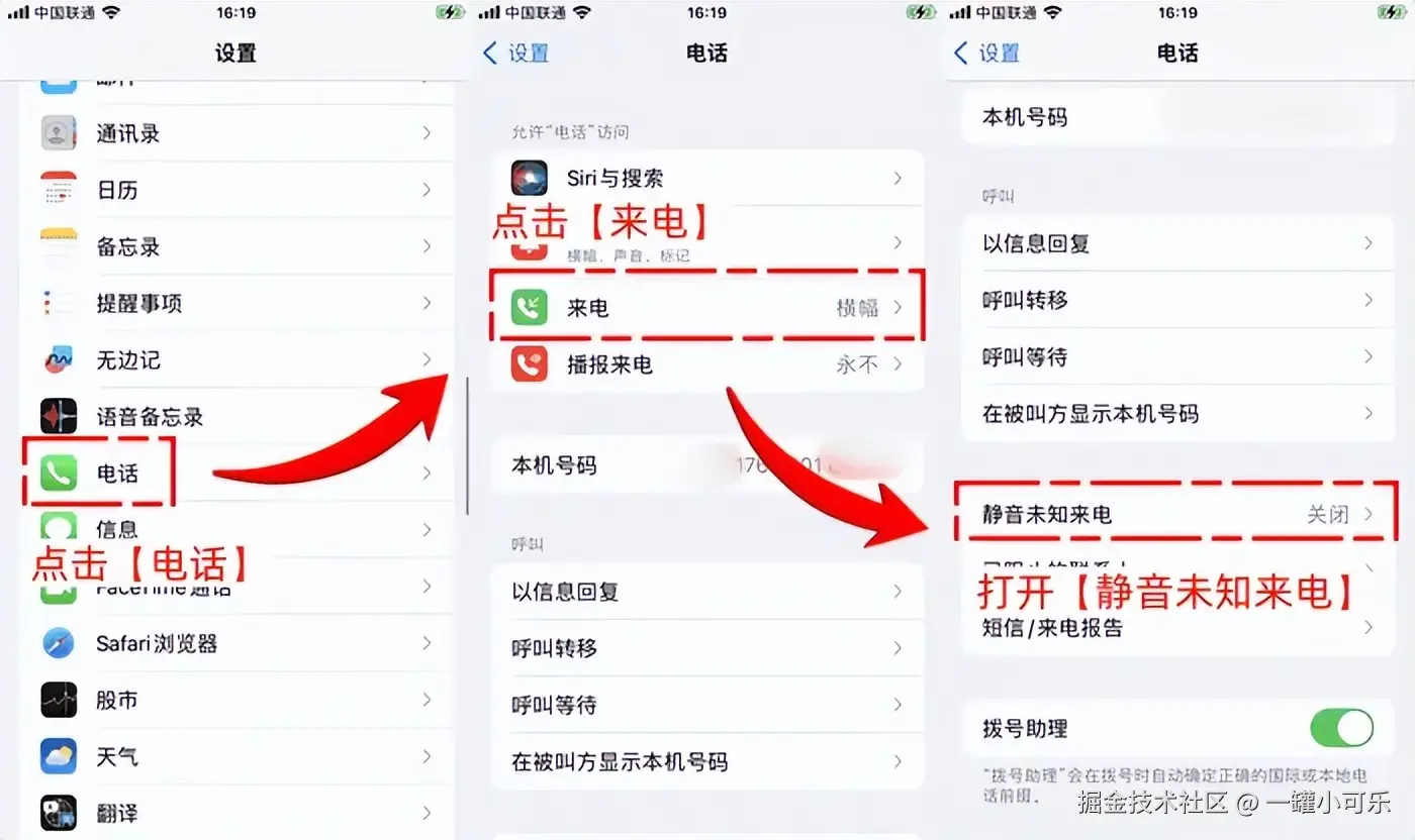 步骤2:在 【电话】 设置界面中,找到并点击 【静音未知来电】 即可。