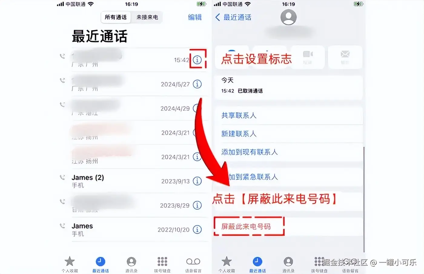 步骤1:在通话记录中找到骚扰号码,点击号码旁边的 【i】 图标,进入详细信息页面。