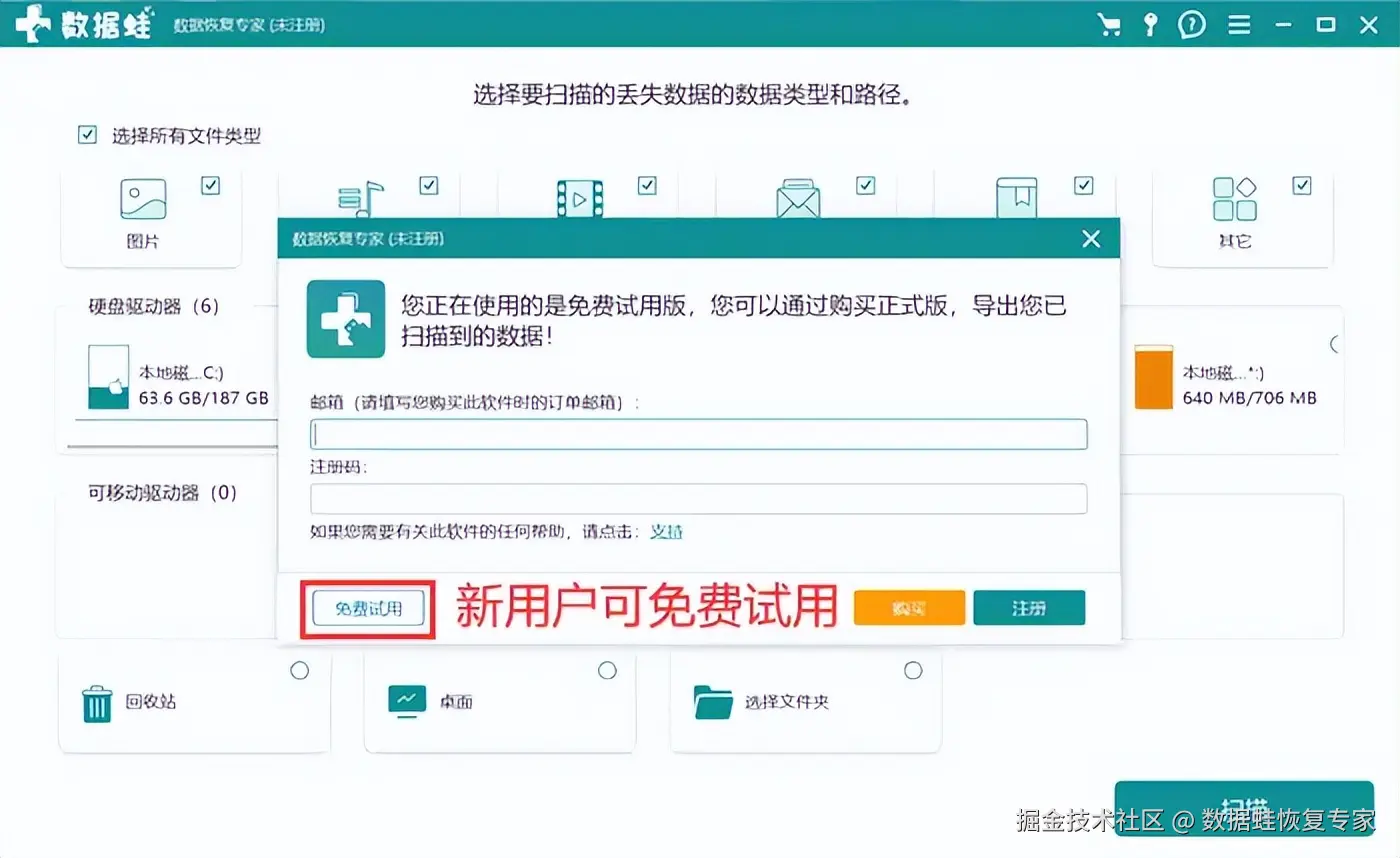 步骤1:安装完成后,你可以选择免费试用,查看有无自己需要恢复的文件。