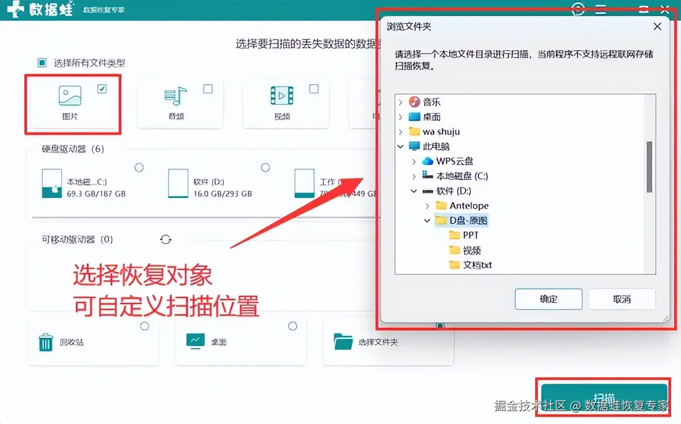 步骤2:在新的界面中选择扫描对象,即 【图片】 及其位置。如果你了解删除照片的具体位置,也可以点击 【选择文件夹】 ,自定义扫描路径。