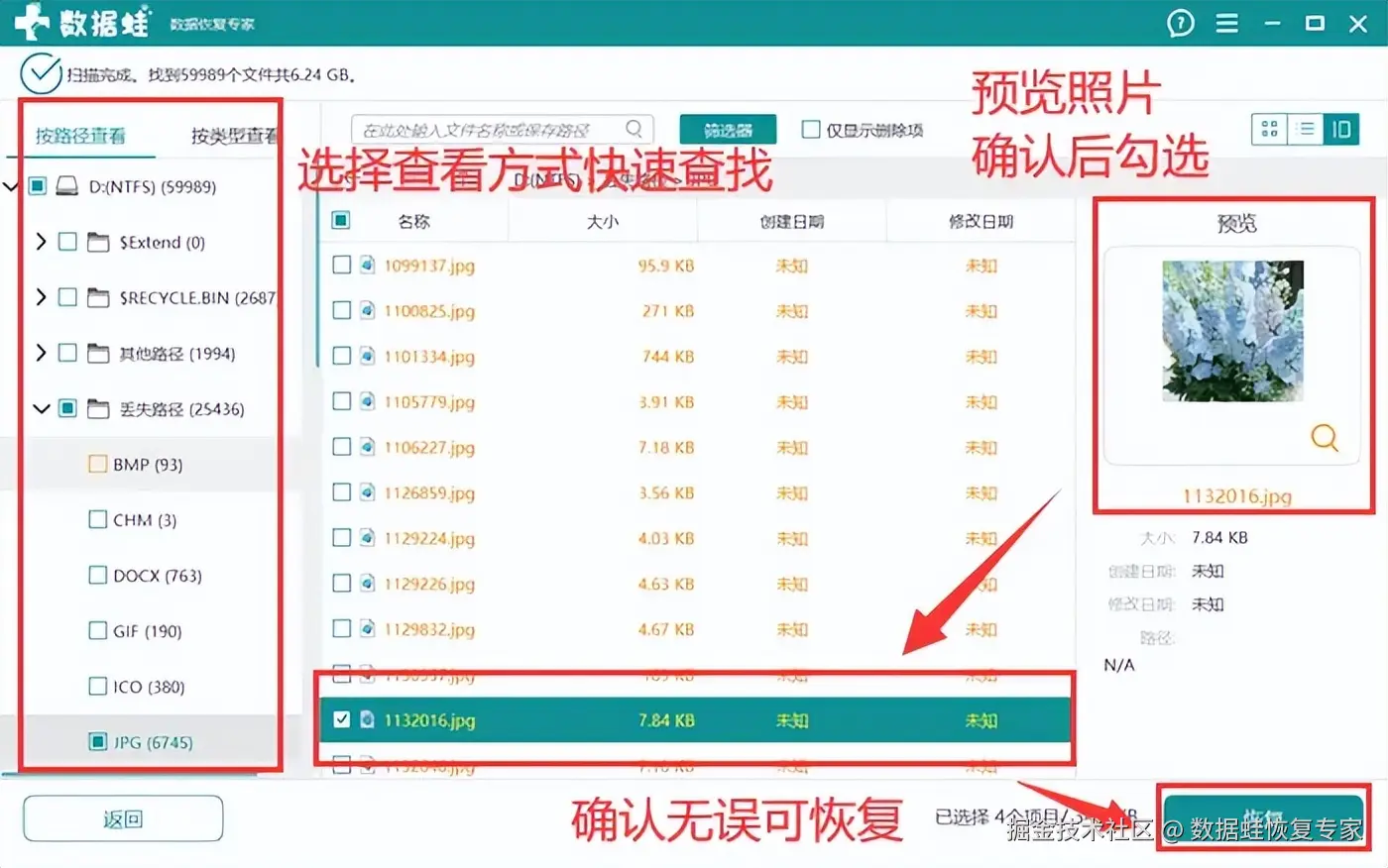 如果以上方法都无法找回你的照片,那么你可能需要用到一些更高级的技巧。例如寻求专业的电脑文件恢复工具,你可以选择【数据 蛙恢复专家】,其不仅支持照片文件的恢复,还可以帮助你找回文档、视频、音频等数据。除了恢复概率较高外,它还有预览功能,能够帮助用户确保选中的照片正是需要恢复的。下面是简单的步骤介绍: