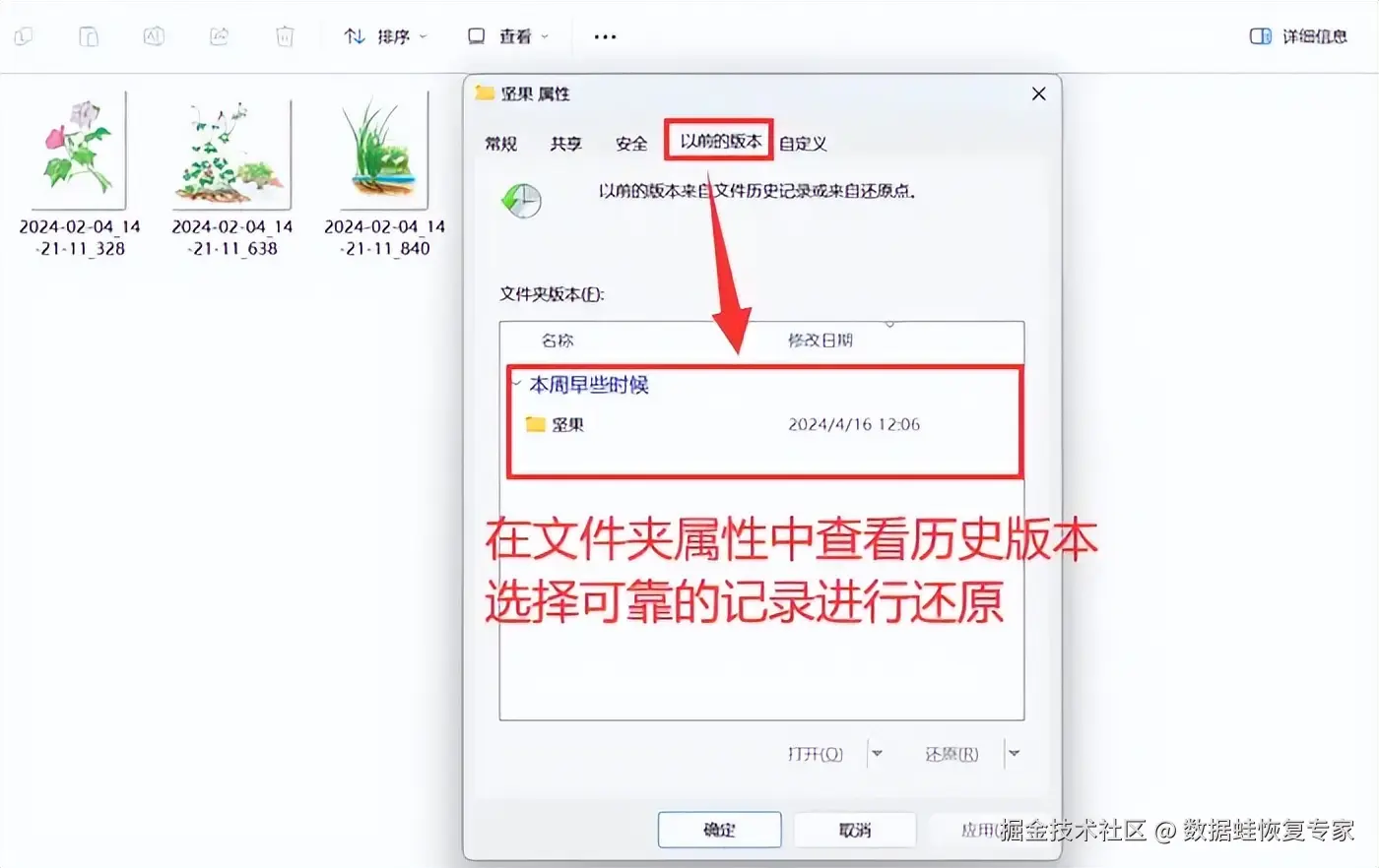 步骤2:选择 【以前的版本】 选项卡,然后查看文件夹的操作记录。确认你删除照片之前的版本,然后点击 【还原】 。
