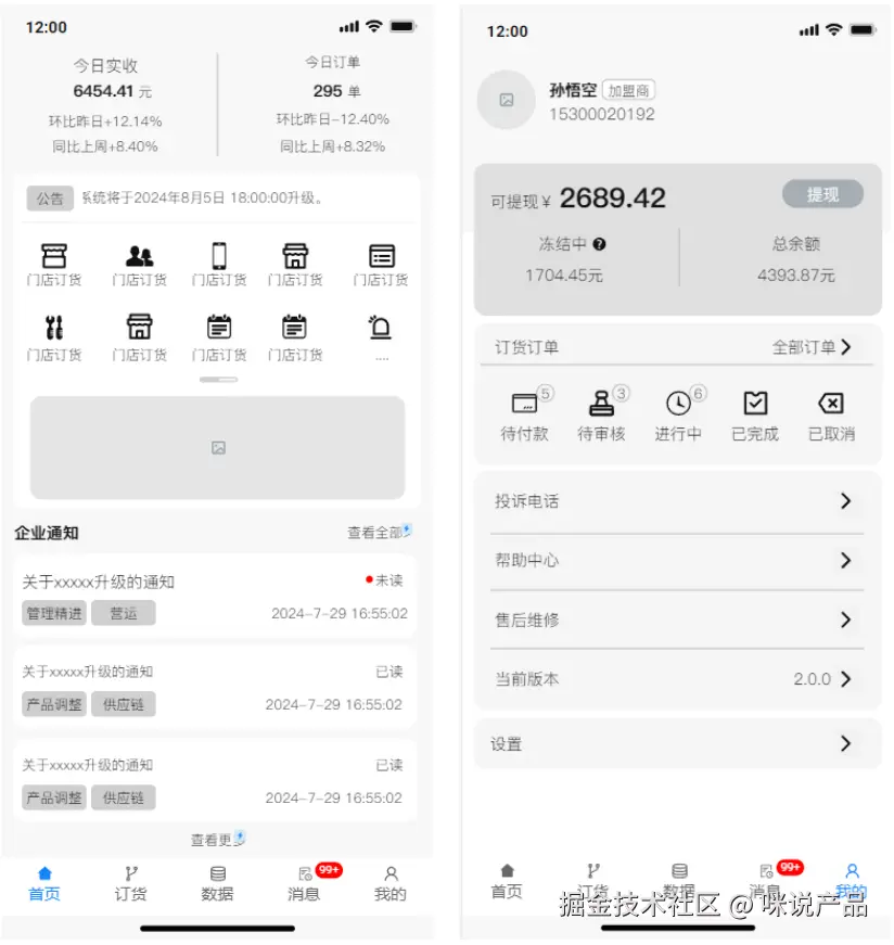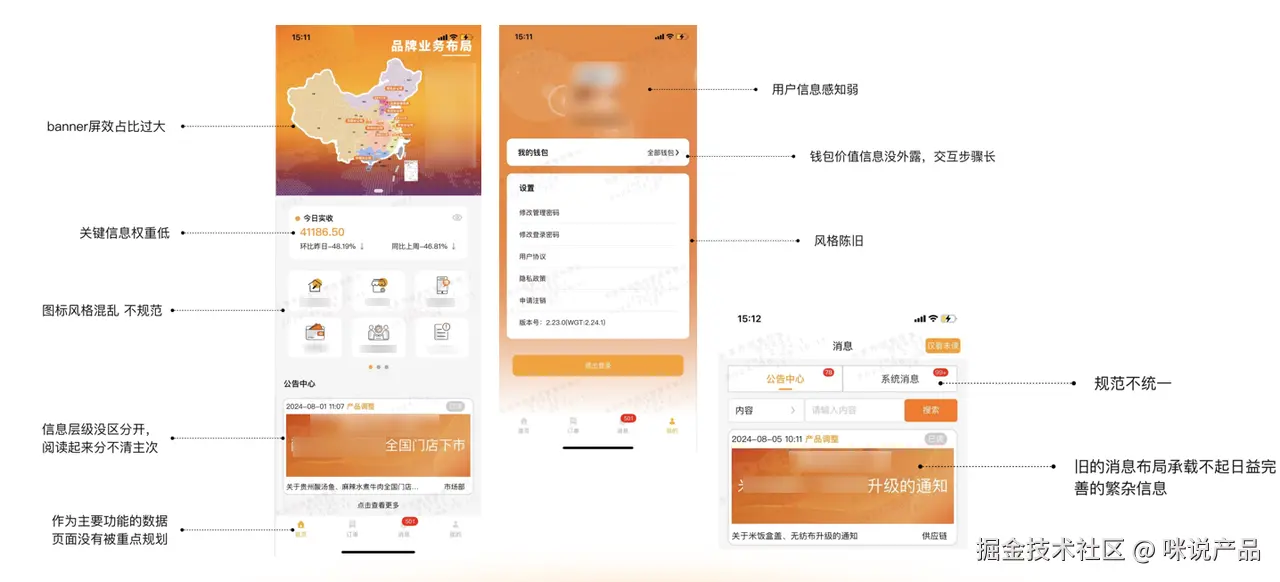 其余功能作为门店辅助运营工具,虽然在一定程度上为加盟商的日常经营提供了支持,逻辑相对较为简单,但各功能的应用相对独立,缺乏明确的层级概念,这使得加盟商在使用过程中可能会感到混乱,难以快速使用产品。在重要信息部分,业务数据的呈现也不够清晰,加盟商难以直观地了解关键业务指标的情况。并且,整体 UI 视觉效果欠佳,无法给用户带来良好的视觉体验,影响用户对产品的使用积极性。