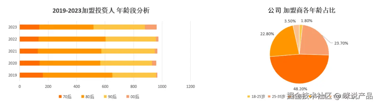 - 从图中可以看出,从 2019 年至 2023 年,加盟投资人的年龄主要集中在 35 岁至 45 岁这个年龄段。这个年龄段的人群通常处于事业的上升期或稳定期,具有一定的经济实力和投资意愿。他们在选择加盟项目时,会更加注重产品的稳定性、盈利能力以及品牌的影响力。