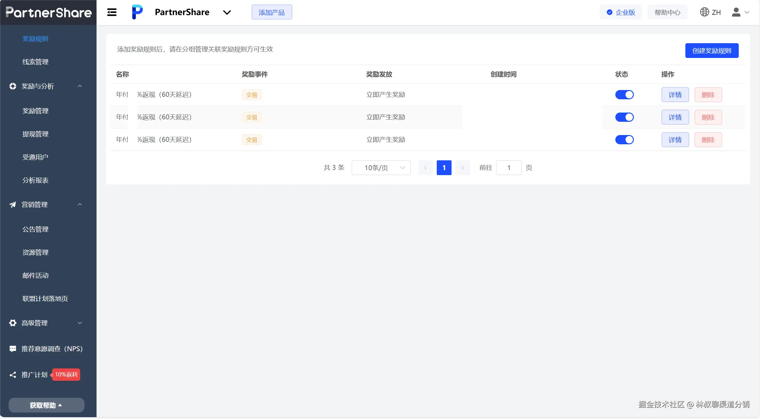 **2.便于管理:**例如,PartnerShare联盟系统企业只需要通过简单的技术对接,即可快速开启推广计划。即可享受完整的分销系统服务。自动化管理合作伙伴,为不同的分组关联相应的奖励规则,支持设置自动晋级门槛和自动奖励分发,轻松跟踪每个分组下合作伙伴的推荐详情,了解他们给您的网站带来的流量和产生的交易。