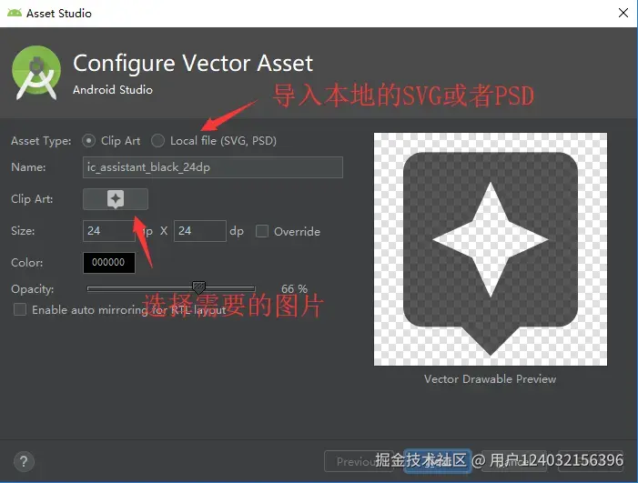 首先我们在AS中运行Vector Asset Studio,步骤是:右键点击你工程中的res文件夹,然后选择 New --> Vector Asset,此时会弹出下面对话框,选择图中标记的对应操作即可导入内置Material图标或者SVG矢量图。