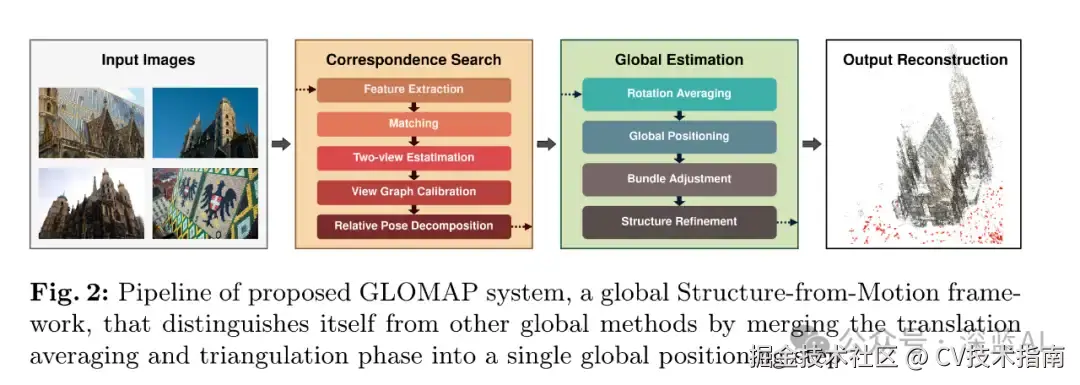 全局SfM流程通常由三个主要步骤组成:对应关系搜索(Correspondence Search)、全局相机姿态估计(Global Camera Pose Estimation)以及联合相机和结构细化(Global Structure and Pose Refinement)。