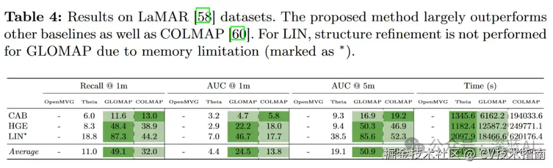 LaMAR是一个大规模的室内和室外基准测试,每个场景包含数万个由各种AR设备和智能手机拍摄的图像。实验结果如表4所示,与其他基线相比,GLOMAP在HGE和LIN上实现了显著更准确的重建,包括COLMAP,同时在速度上比COLMAP快几个数量级。在CAB上,包括COLMAP在内的所有方法表现不佳,特别是在视觉检查中,由于存在许多前向运动轨迹、剧烈的昼夜光照变化,以及楼层/房间之间的许多对称性和重复外立面,这对这个极具挑战性的基准造成了很大的影响。