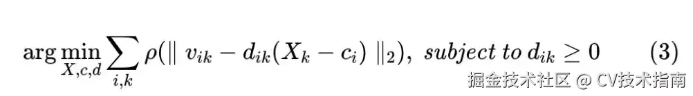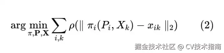 Global Bundle Adjustment: 全局束调整对获得准确的最终3D结构 , 相机外部参数 和相机内部参数 至关重要。它被形式化为一种联合鲁棒优化, 目标是最小化重投影误差, 如公式2所示: