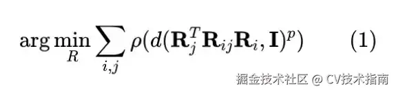 Rotation Averaging: 也称为旋转平均,与位姿图优化(PGO)算法相关。该问题通常被表述为非线性优化,惩罚全局旋转与估计的相对位姿之间的偏差。实际上,由于噪声和异常值,该问题通常通过鲁棒最小度量目标进行建模并优化为(如公式1所示):