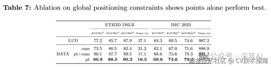 为了证明全局定位策略的有效性,通过替换组件进行实验,一是仅添加相对位移约束,称为(BATA,cam),以及二是添加点和位移约束(BATA,cam+pt)。在 ETH3D MVS(DSLR)和IMC 2023上进行了测试。结果表明(如表7所示),相对位移约束会降低收敛性和整体性能。