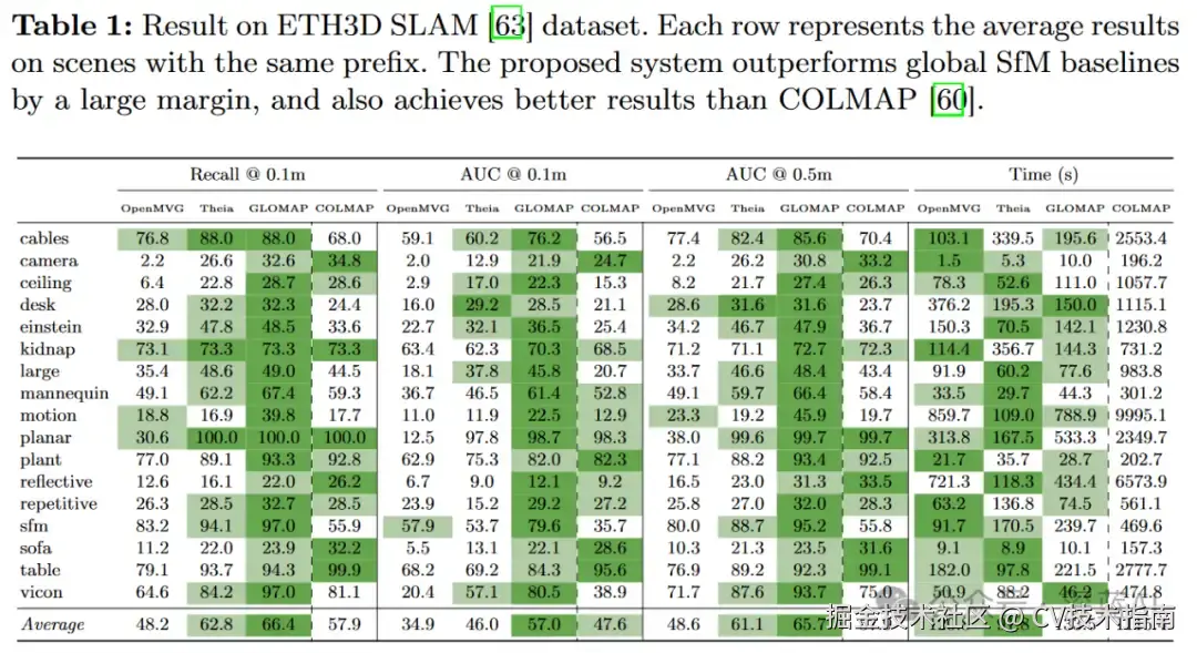 数据集ETH3D SLAM包含稀疏特征、动态物体和剧烈光照变化的序列数据。在具有毫米级精确地面真值的训练序列上进行方法评估。结果表明(如表1所示),GLOMAP系统的召回率比COLMAP高出约8%,在0.1m和0.5m阈值下分别提高9分和8分,且COLMAP的速度慢一个数量级。与其他全局SfM流程相比,GLOMAP在召回率上提高了18%和4%,在0.1m下AUC高出约11分,确认了其稳健性。