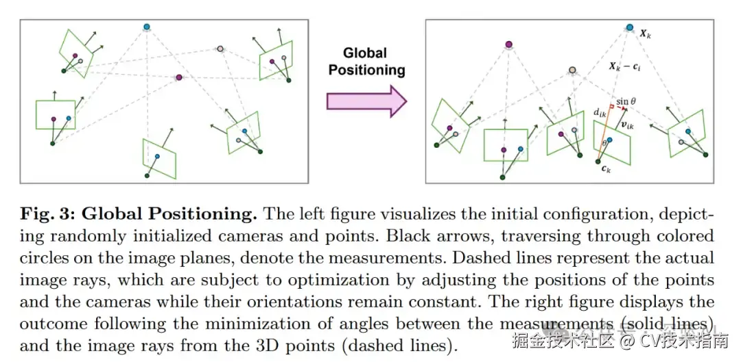 这个步骤旨在共同恢复点和相机位置(如图3所示)。作者这里没有先执行平移平均然后进行全局三角化,而是直接执行联合全局三角化和相机位置估计。针对标准增量和全局SfM系统中,目标函数初始化和误差的问题,本方法的目标函数,使用归一化方向差异作为误差度量。原始形式是基于相对平移提出的,而这里舍弃了相对平移约束,仅包括相机光线约束。具体来说,问题被建模和优化为: