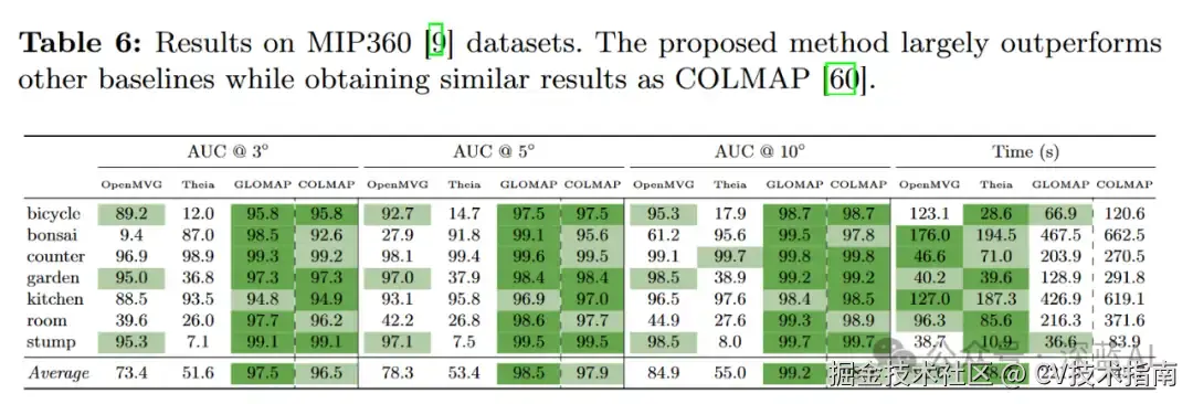 MIP360包含7个以物体为中心的场景,这些场景的高分辨率图像是由同一相机拍摄的。如表6所示,GLOMAP与全局SfM基线相比,显著更接近参考模型。GLOMAP速度超过COLMAP的1.5倍。