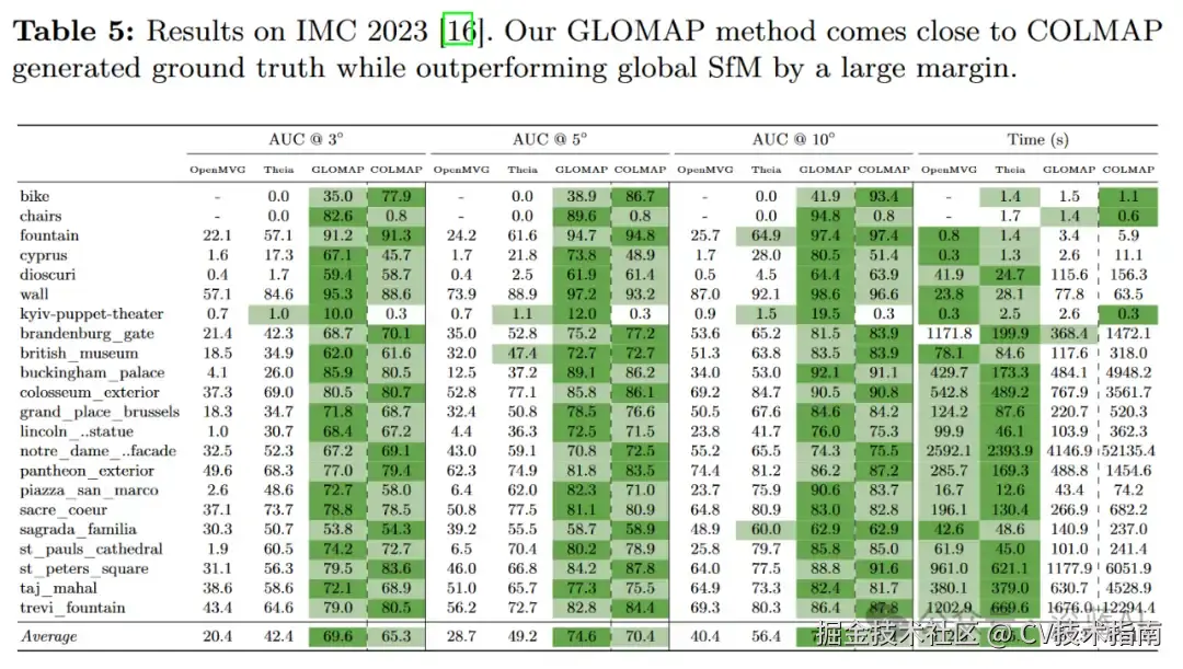 IMC 2023包含在复杂场景中unordered(无序)的图像集合。图像来自多个来源,通常缺乏先前的相机内参。结果如表5所示。GLOMAP在3°、5°和10°下的平均AUC分数比其他全局SfM基线高出几倍。运行时间与其他全局SfM流程相似。与COLMAP相比,所提方法在3°、5°和10° 下的AUC分数高出约4分,并且速度快约8倍。