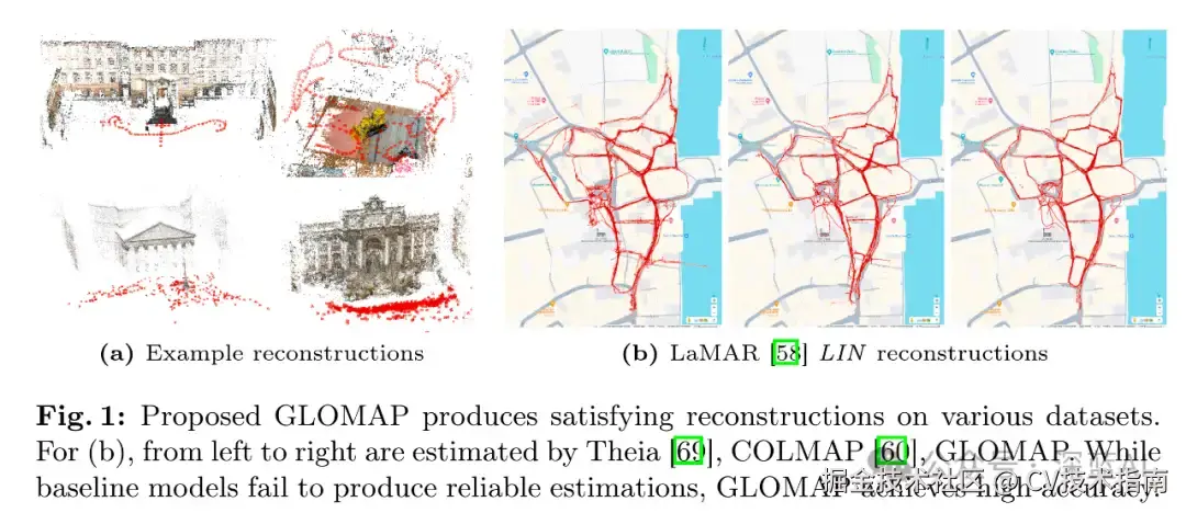 - GLOMAP在保持全局SfM流程效率的同时,达到了当前最前进的增量SfM系统相似的鲁棒性和精度(如图1a所示)。
