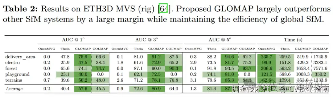 ETH3D MVS(rig)每个场景包含约1000个多机rig曝光,每个曝光4张图像。该数据集包含室外和室内场景,5个训练序列具有毫米级的地面真值。结果如表2所示,GLOMAP成功重建了所有场景。相比之下,OpenMVG在所有场景上的表现较差,而COLMAP在一个场景上失败,Theia的表现始终低于本文的方法。在COLMAP成功的序列中,GLOMAP达到相似或更高的精度,其运行时间比全局SfM基线略慢,但比COLMAP快约3.5倍。