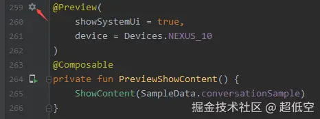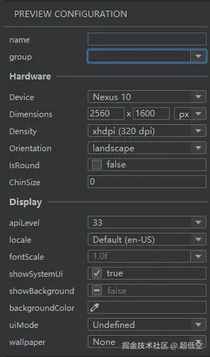 可以通过点击@Preview注解旁边的齿轮按钮配置预览参数,比如分辨率,横竖屏,日夜模式等