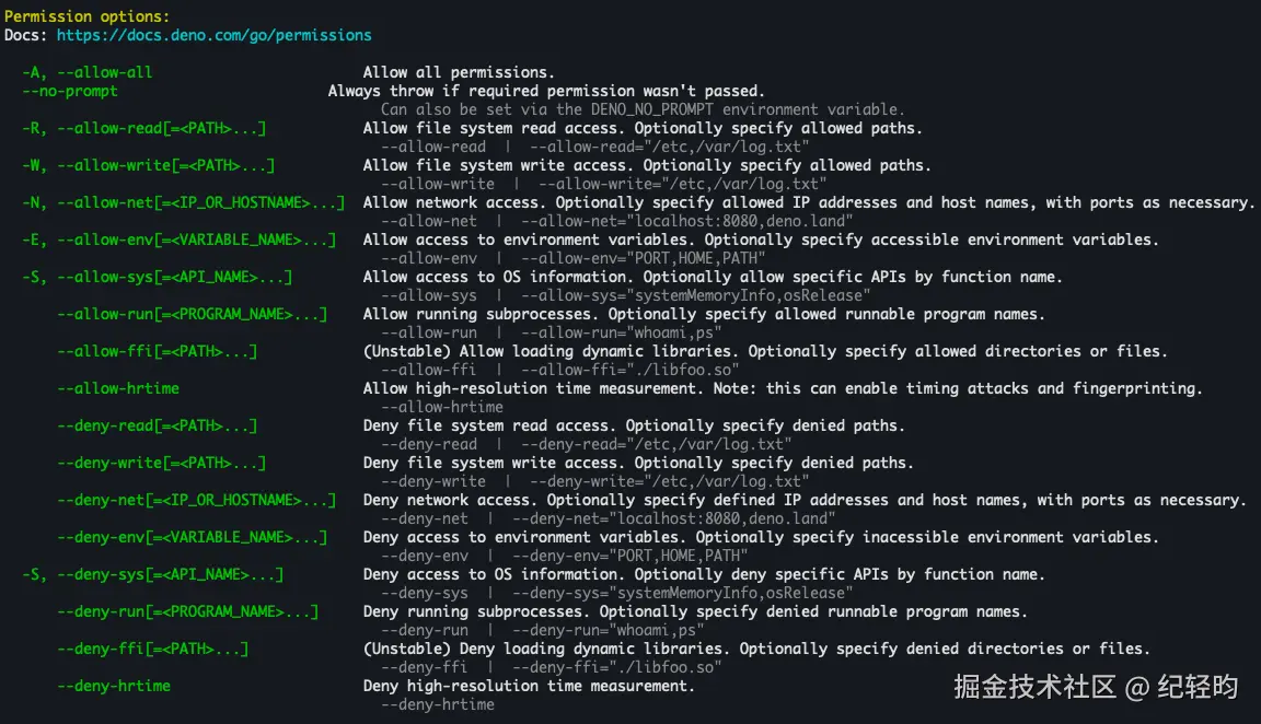 这些简写标志与长格式一样接受允许列表 - 例如,-R=./static、-E=DEBUG,LOG、-N=deno.com。