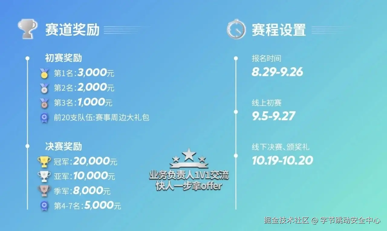 ByteAI赛道聚焦大模型安全,考察选手如何在大模型时代进行创新性攻击,以“攻击突破”促进大模型防御。线下决赛由字节AI方向导师亲临指导,通过案例展示等,与选手共同探讨AI与安全的共生、可持续之道。