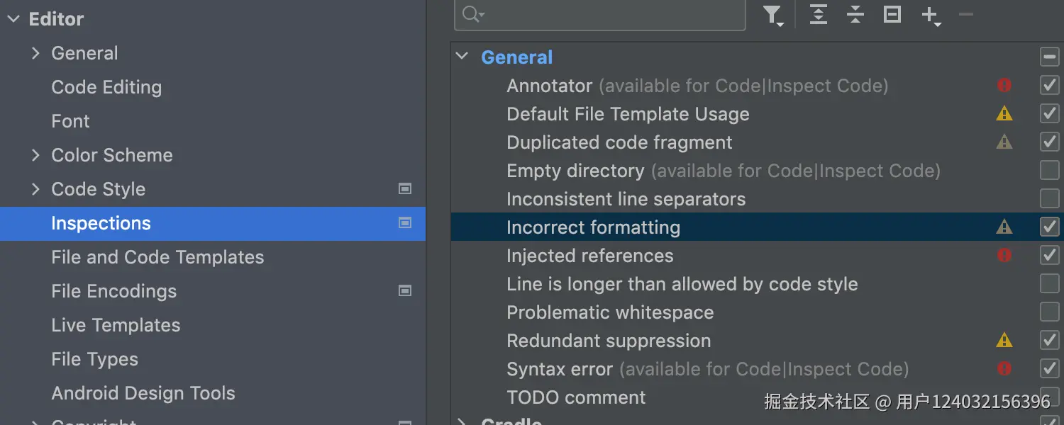 实现了“Incorrect formatting”检测,如果文件的当前格式与代码样式设置不匹配,IDEA将会通知开发者。大家可以通过下面的方式配置开启或关闭。