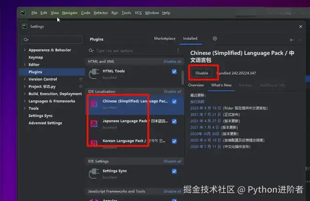 粉丝还说:我奇怪的是明明pycharm上对应的插件文件,我都从文件夹删除了,汉化插件竟然一直残留着,又不提供卸载选项,都怀疑是不是24.2内置了,去官网翻了一下更新日志,也没有说内置汉化插件。