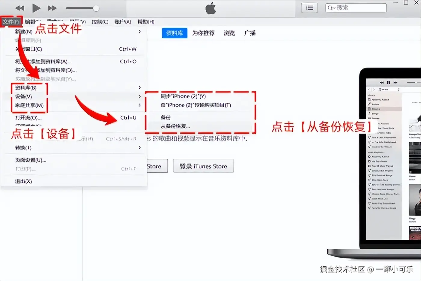 步骤2:点击iTunes的屏幕顶端的 【文件】 选项,选择 【设备】 选项,点击 【从备份恢复】 即可。