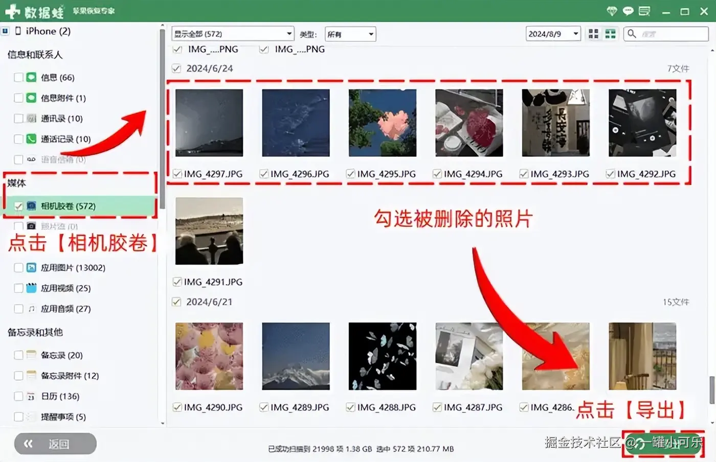 步骤3:在扫描结果界面上,点左侧应用栏的 【相机胶卷】 选项,找到被删除的照片并勾选,最后点击 【导出】 即可。
