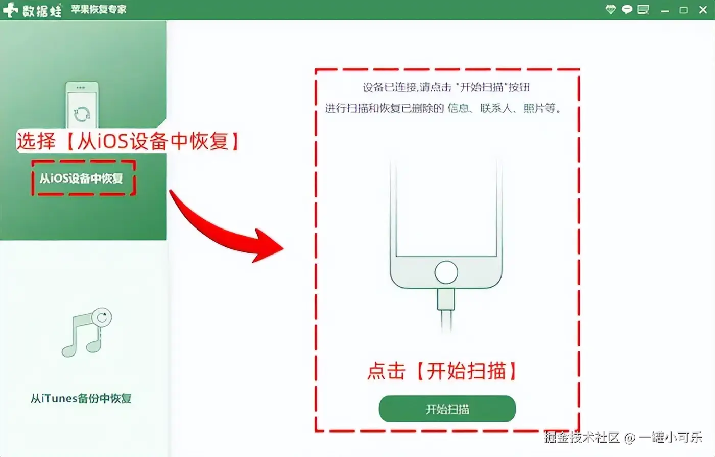 步骤1:下载工具后,用数据线连接手机和电脑,选择 【从iOS设备中恢复】 的数据扫描方式,然后点击 【开始扫描】 。