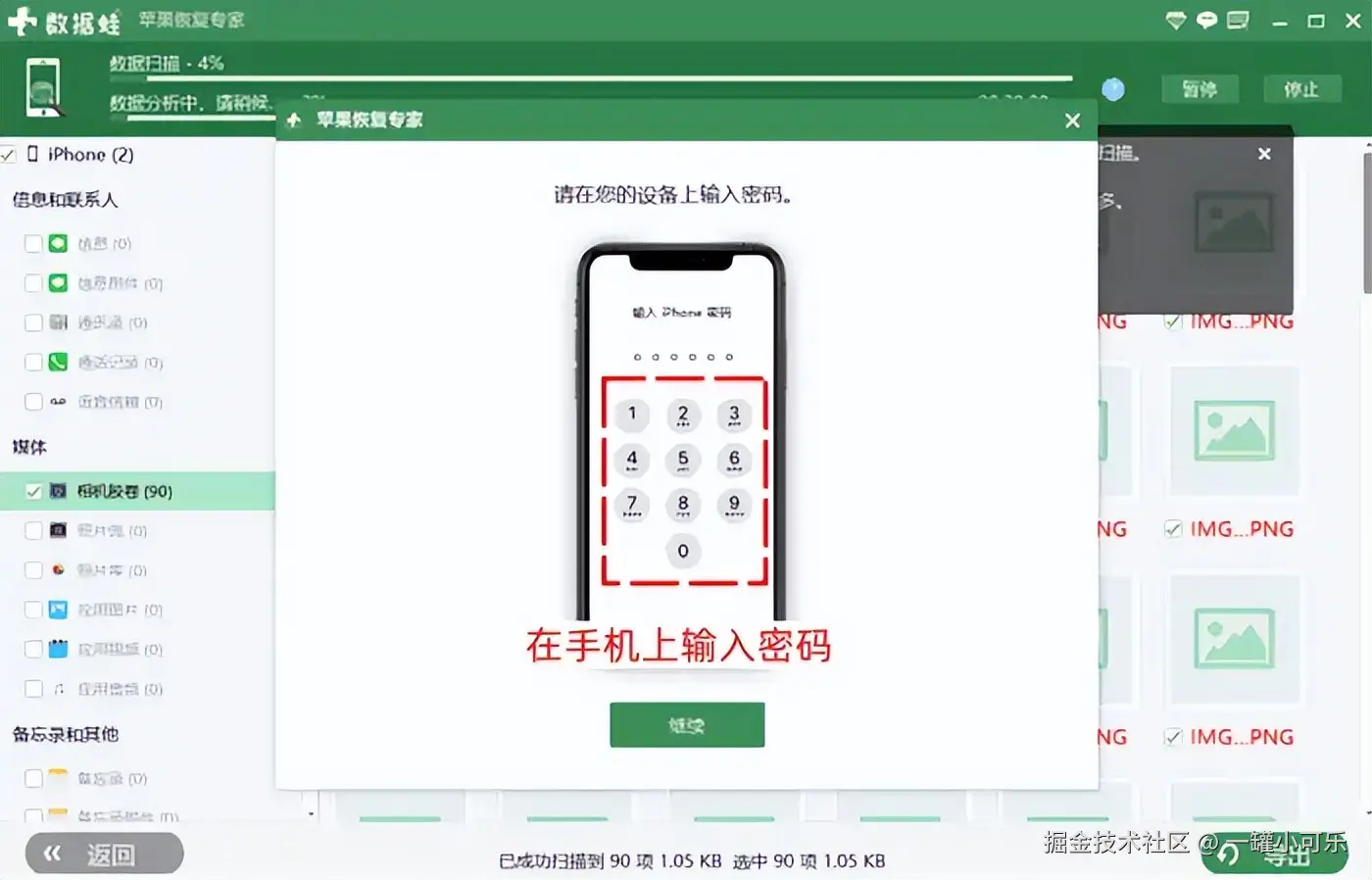 步骤2:在扫描数据的过程中,屏幕上会弹出类似 【需要在手机设备上输入信任密码】 的提示,根据提示在手机上输入密码即可。