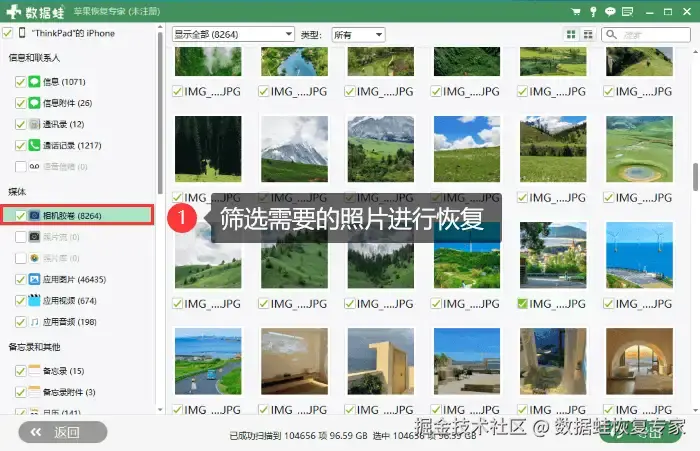 步骤3:扫描完成后选择 【相机胶卷】 ,勾选需要恢复的照片,点击 【导出】 按钮,照片就会被恢复到您设定的位置里。