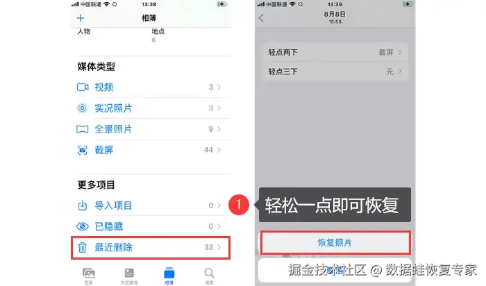 步骤2:找到并选中需要恢复的照片,点击 【恢复照片】 按钮,照片将自动恢复到相簿中。