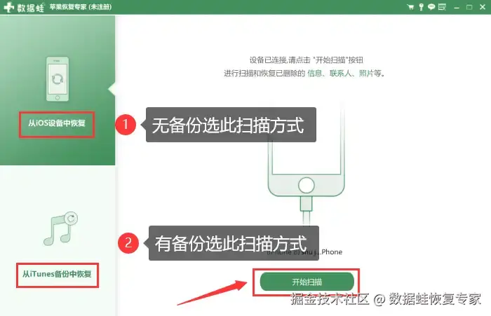 步骤1:使用USB数据线将苹果手机连接到电脑上,打开软件根据实际情况选择合适的扫描方式,点击 【开始扫描】 。