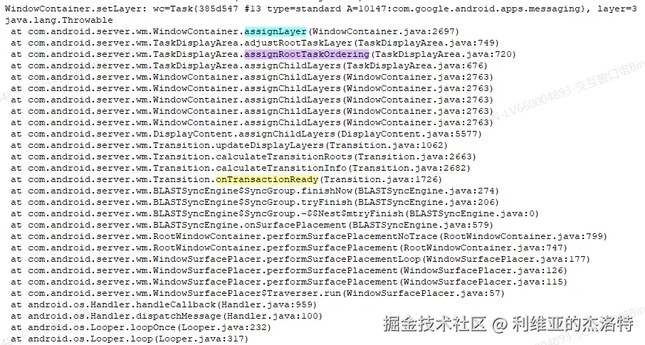 因此我就直接认为是SF侧没有把Launcher对应的Task移动到TaskDisplayArea的top,比如Transaction.setLayer这个方法没有被调用之类的,但是继续打印log后才发现,正常情况下也没有为Home类型的Task设置layer的操作,这个分析方向是错的。
