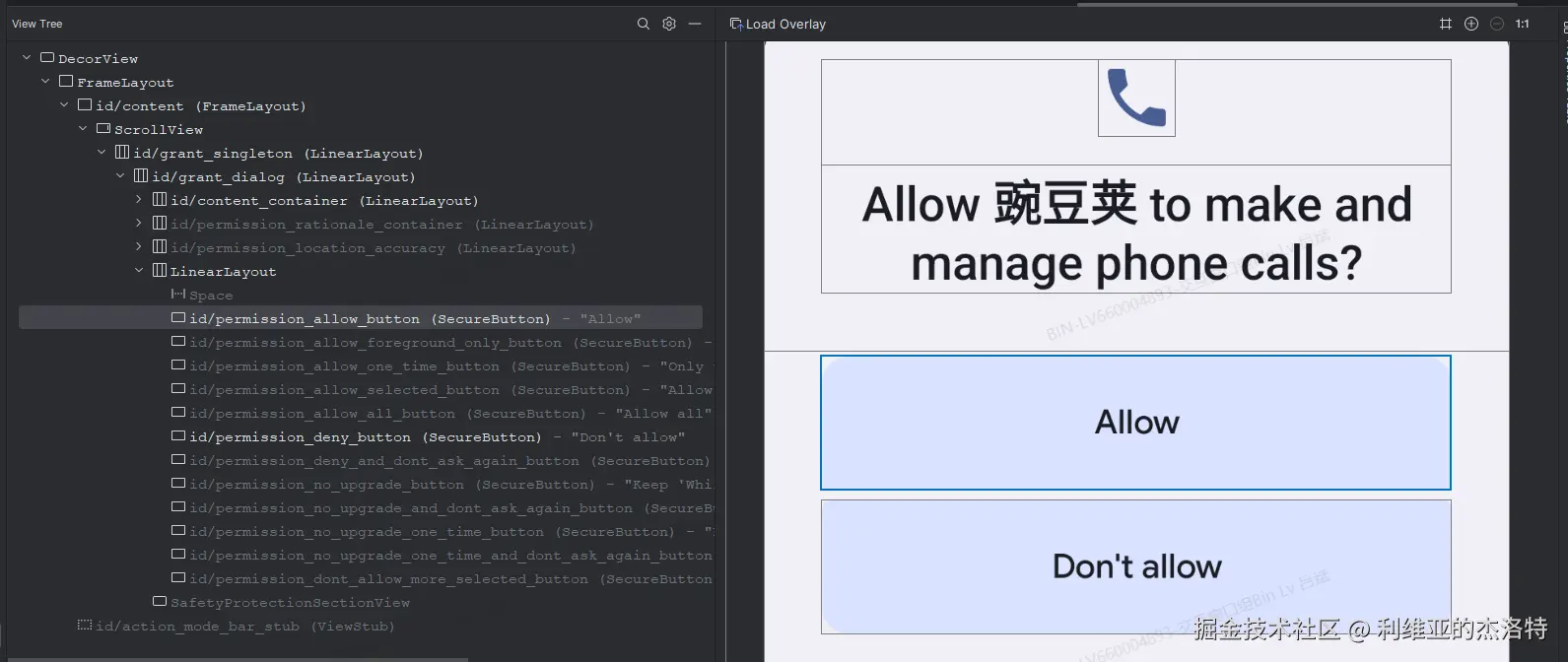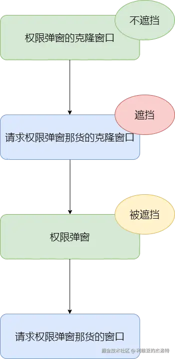 打印了log后发现其实原理很简单,完全重合后,点击的区域就是权限弹窗的克隆窗口,这个克隆窗口同样也能接收事件,因此事件直接被权限弹窗的克隆窗口接收了: